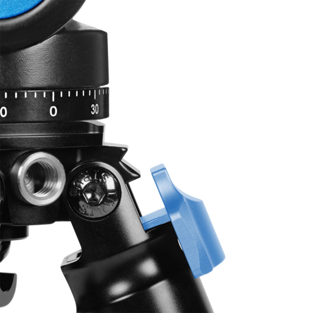 Jalustan päällä on sekä 1/4″- että 3/8″-kierteet, joten siihen voi kiinnittää lähes minkä tahansa jalustapään ilman adapteria.